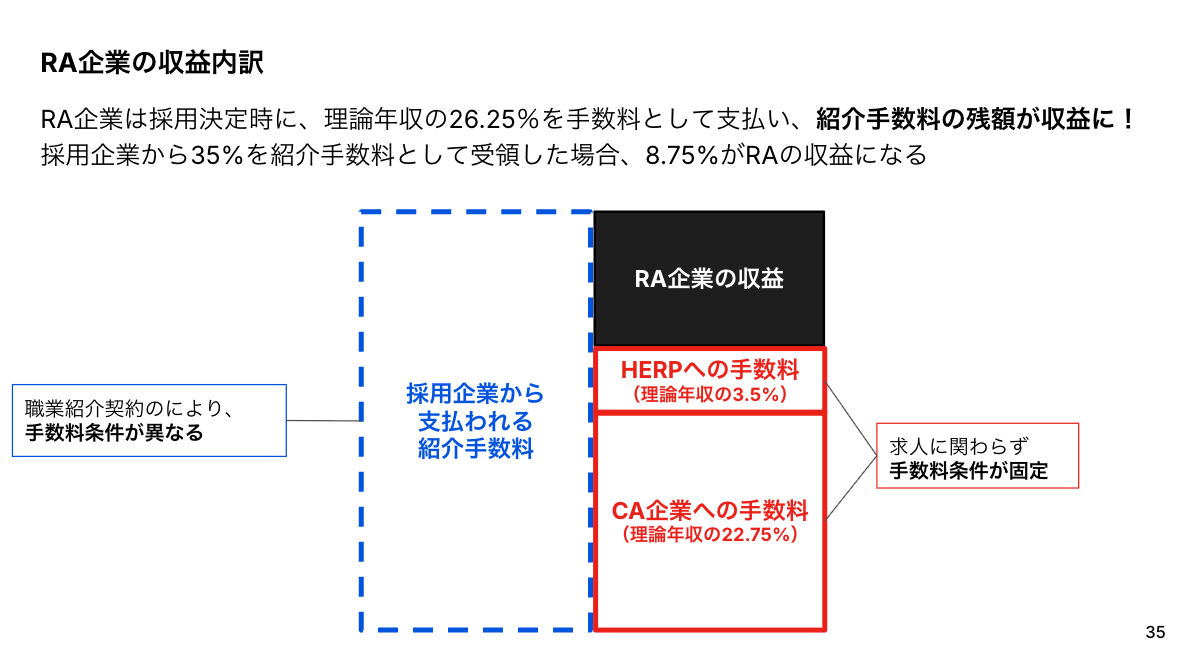 CAエージェント、HERPに支払いいただく手数料率は固定のため、紹介手数料が理論年収の30%の求人で成約した場合、RAエージェントの売上は理論年収の3.75%になりますのでご注意ください。