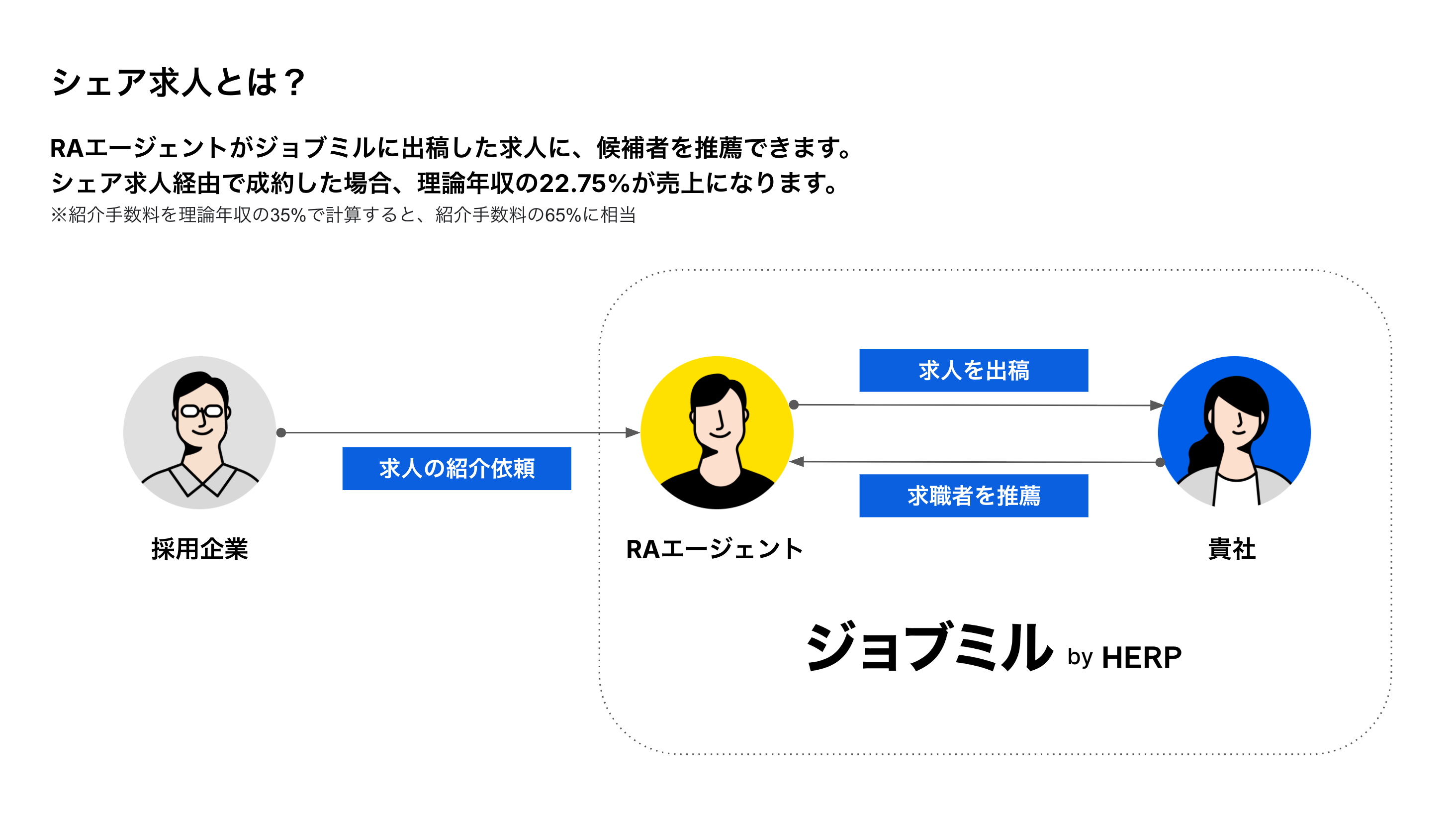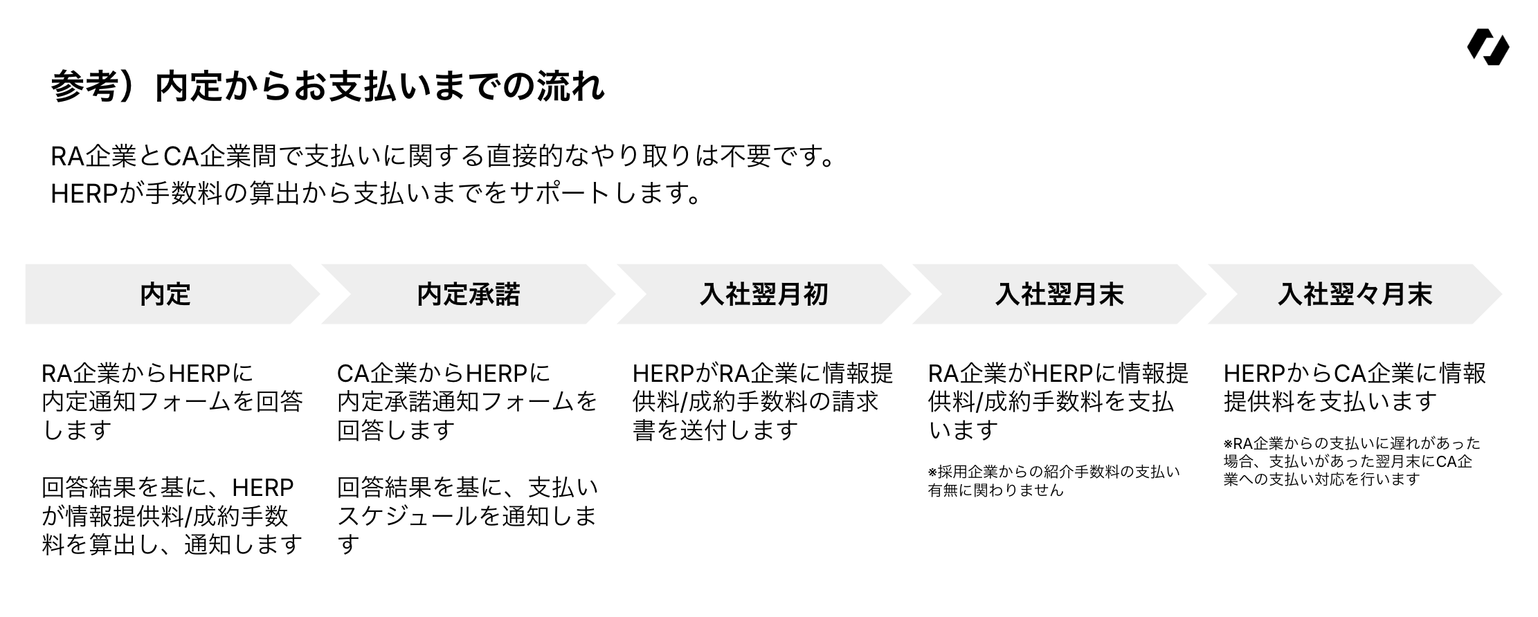 RAエージェント(求人企業紹介エージェント)側は、CAエージェント(求職者紹介エージェント)側から求職者を推薦され、当該求職者が入社した際に情報提供料をCAエージェント、成約手数料をHERPに支払います。