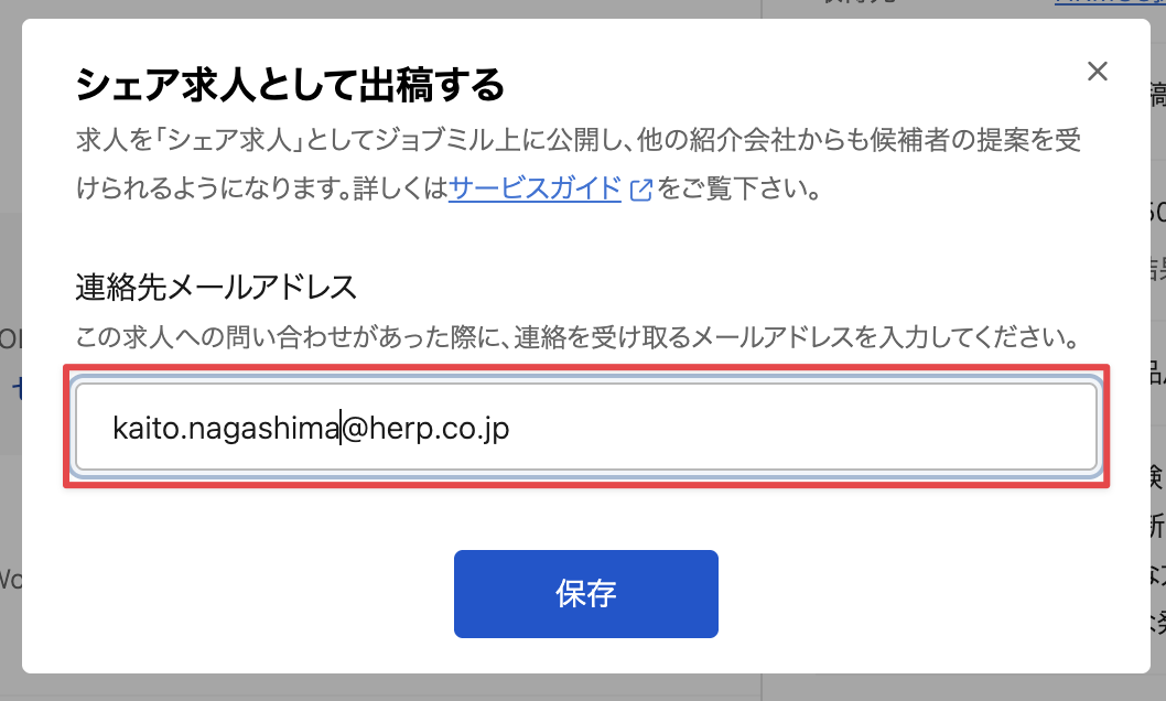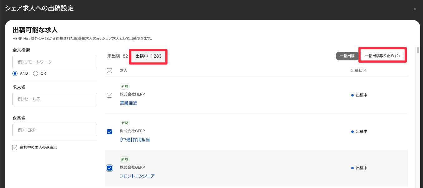 ジョブミルにATS連携によって取り込まれた求人のみシェア求人として出稿できます。また、HERP Hireの求人をシェア求人として出稿することはできません。
