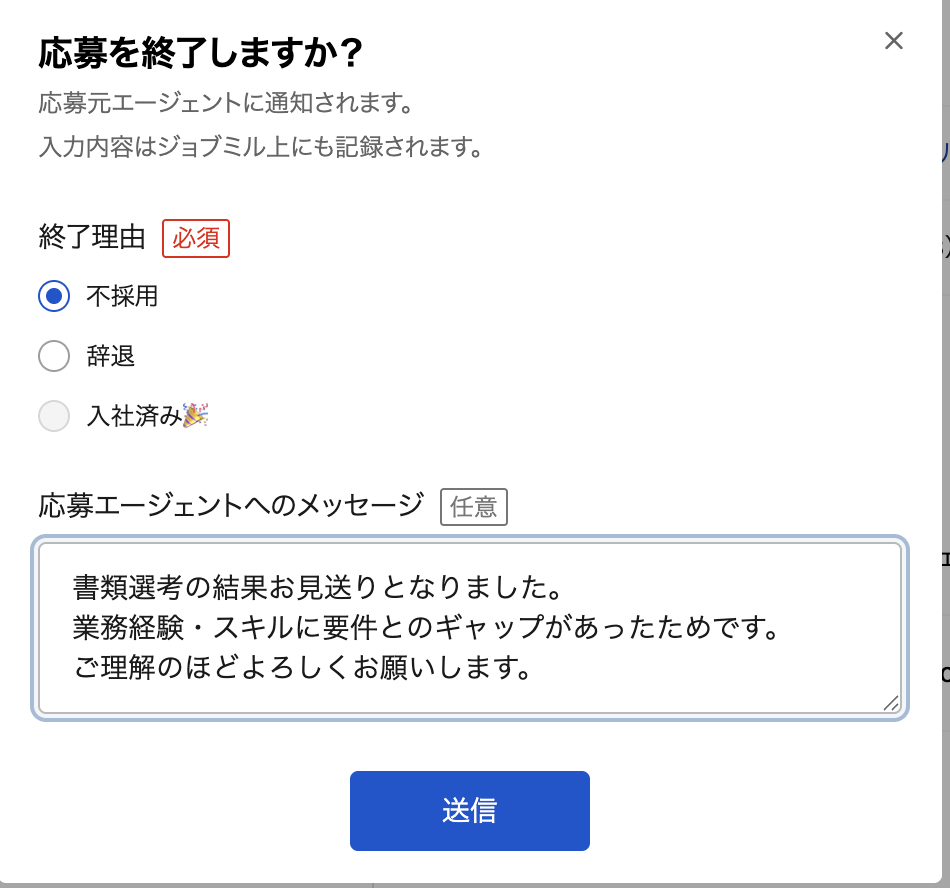 ジョブミル上で選考を終了すると、CAエージェントにメール通知が届きます