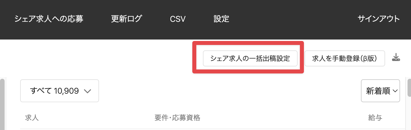 「求人」画面右上の「シェア求人の一括出稿設定」をクリックします。