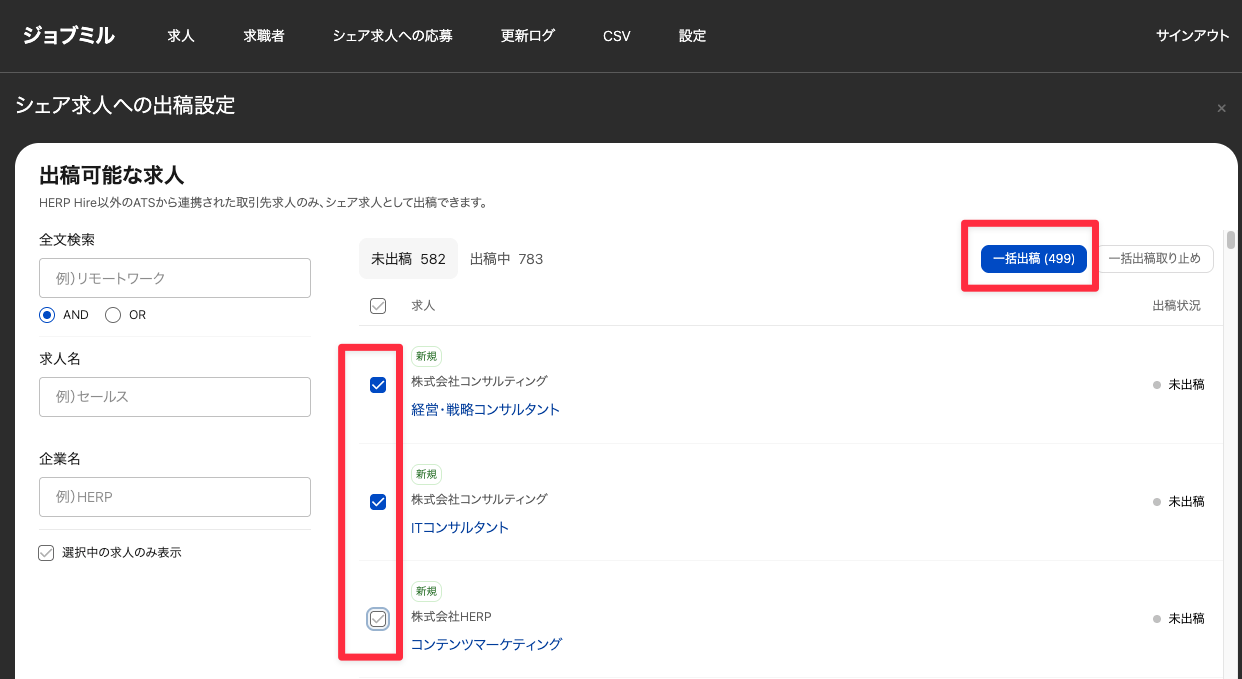 シェア求人に「未出稿」の求人が一覧表示されます。出稿したい「求人」にチェックを入れ、右上の「一括出稿」をクリックします。