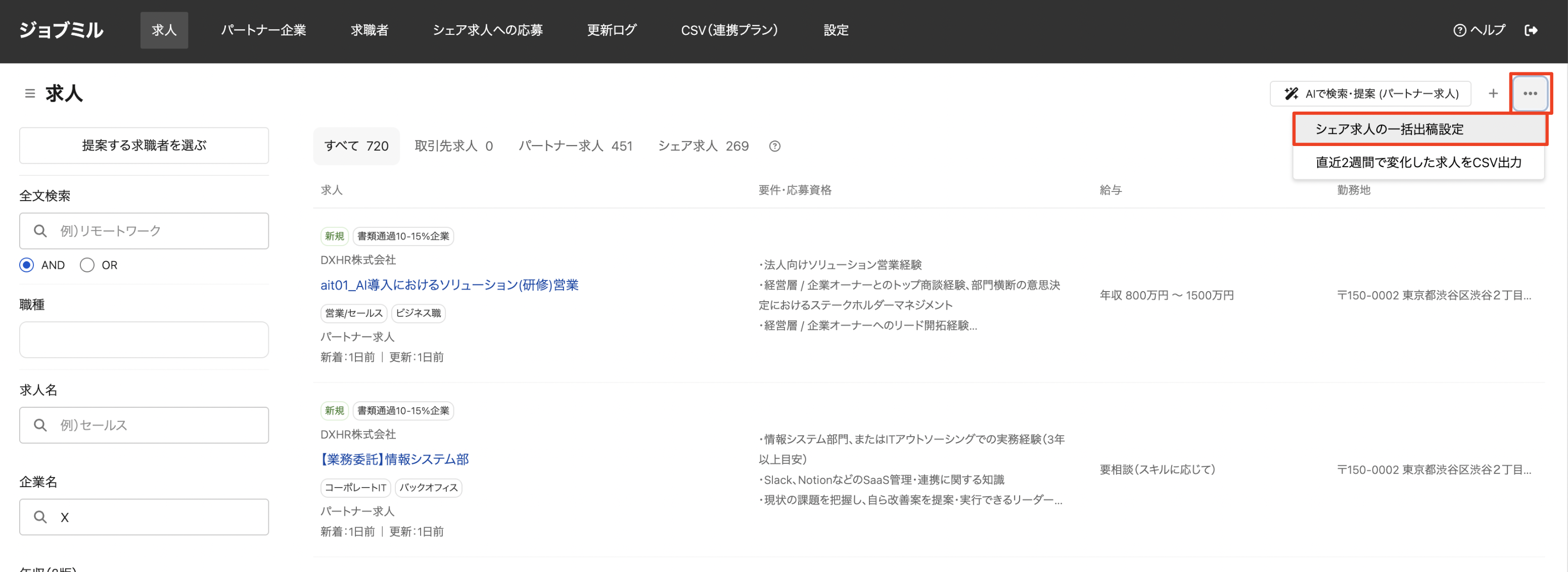 「求人」画面右上の三点リーダーから「シェア求人の一括出稿設定」をクリックします。