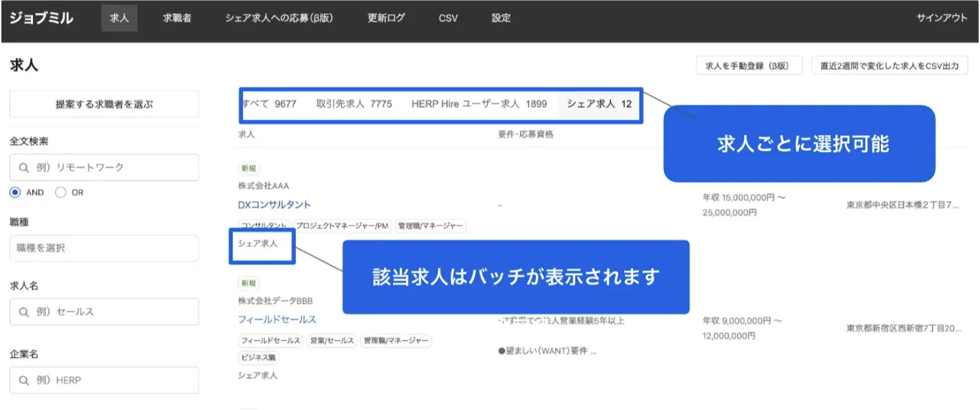 検索時に画面上部の「シェア求人」をクリックし、シェア求人のみに絞って表示することも可能です。