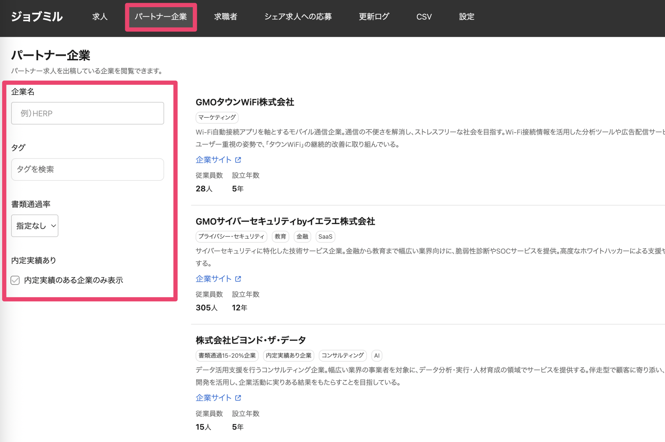 このページでは、「パートナー求人」の企業一覧の利用方法についてまとめています。企業概要と、過去のジョブミル経由の実績(書類通過率・内定実績)を照らし合わせながら、データに基づいた戦略的な企業選定が可能になります。