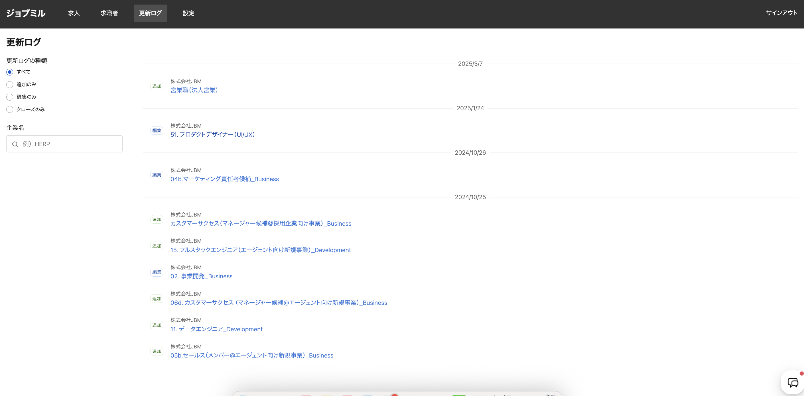 このページでは、更新ログについてまとめています。「更新ログ」は、ジョブミルに連携した取引先求人に更新(追加/編集/クローズ)があったことを検知した履歴です。