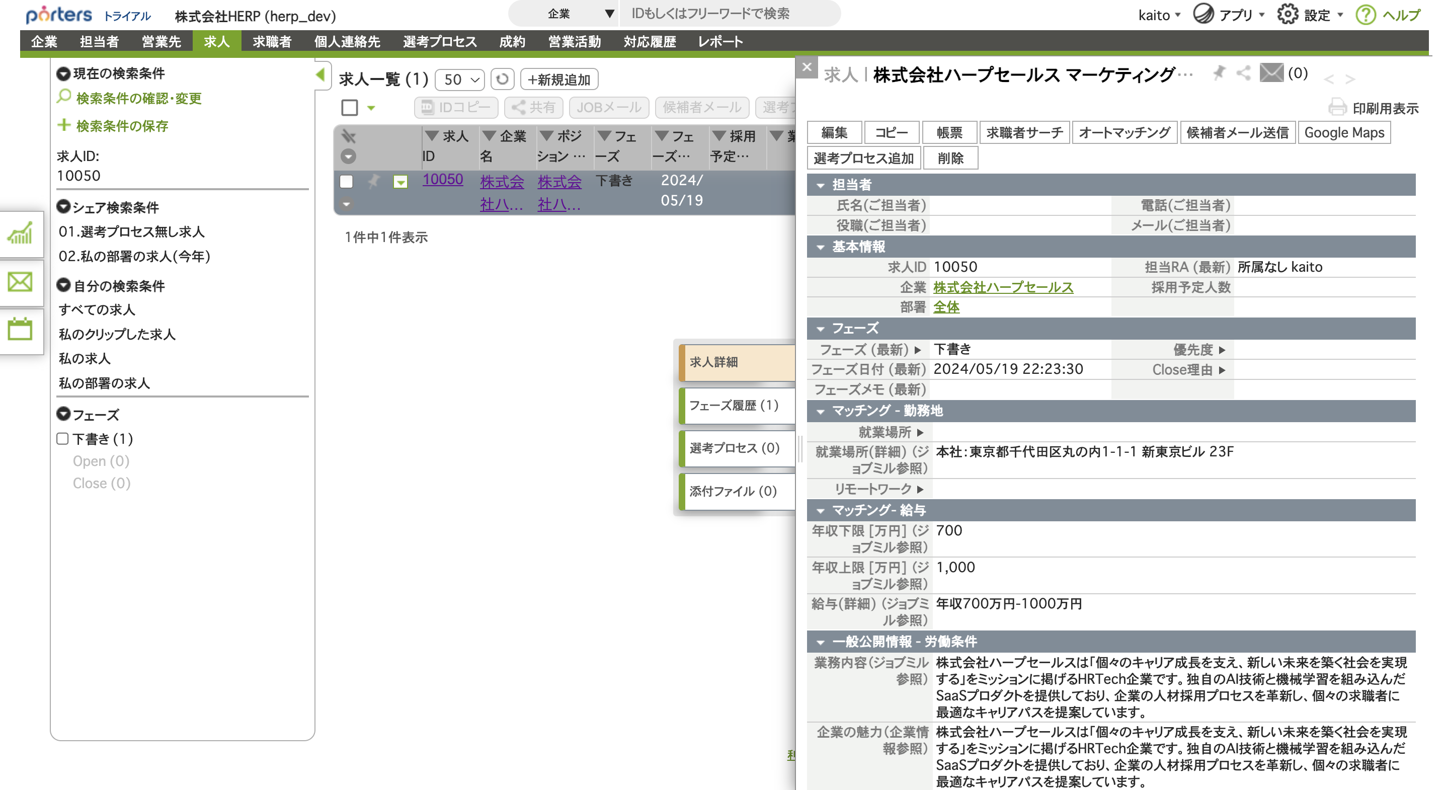 PORTERSの求人詳細ページに遷移します。求人は「下書き」のフェーズで登録されます。