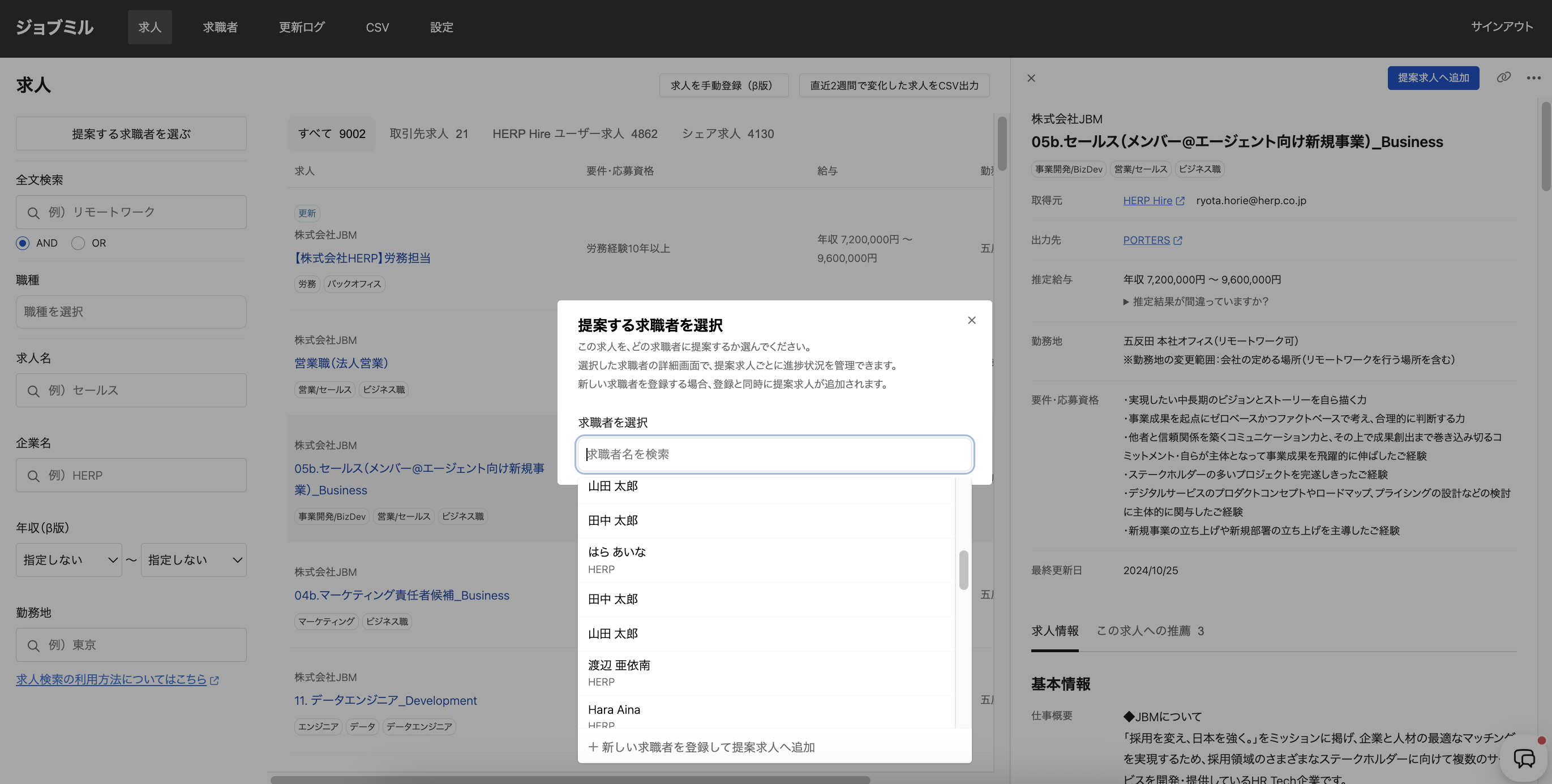 3. モーダルで求職者を検索・選択し、[追加] をクリックします。