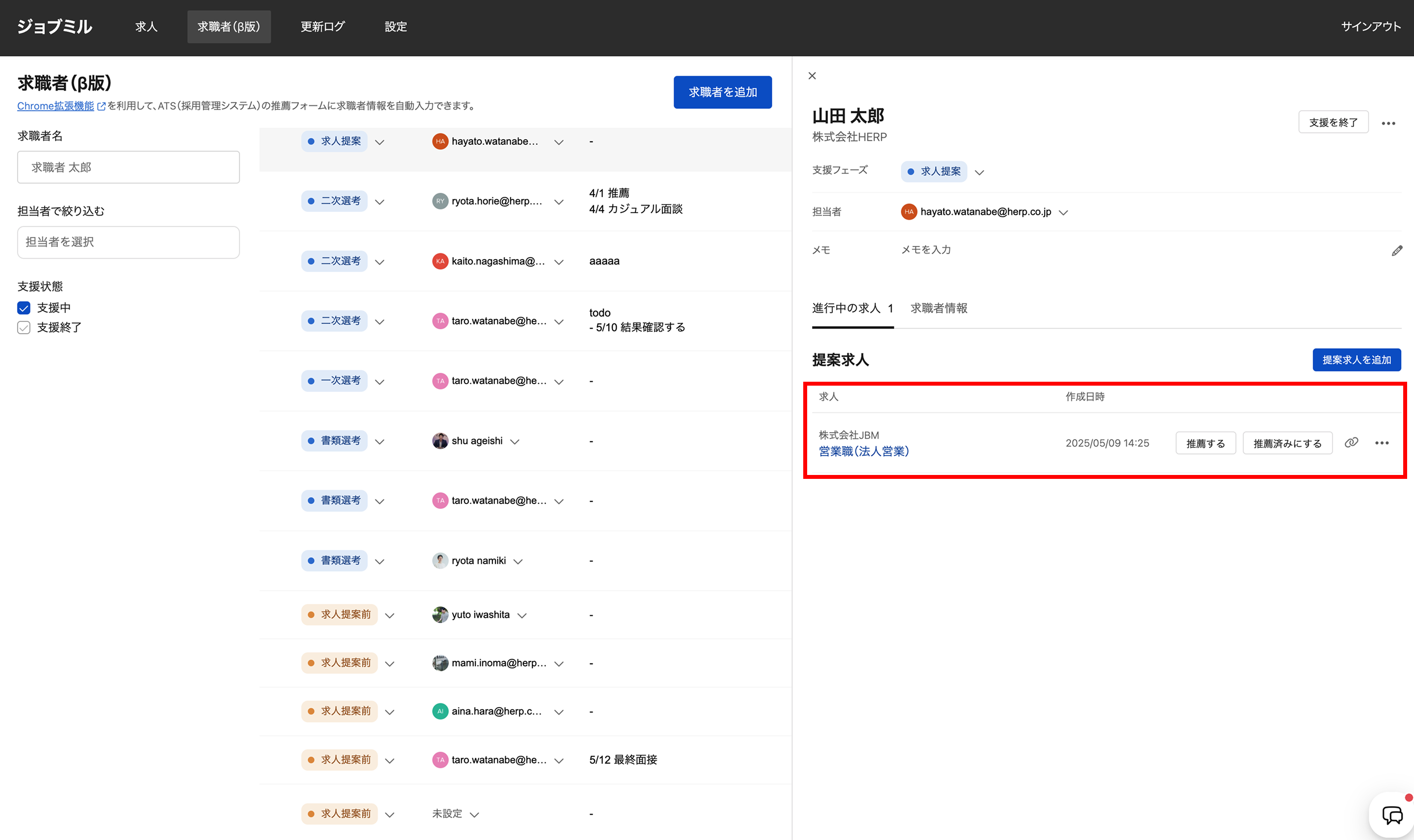 求人一覧で求職者を選択し、複数求人をまとめて提案求人に追加する方法です。