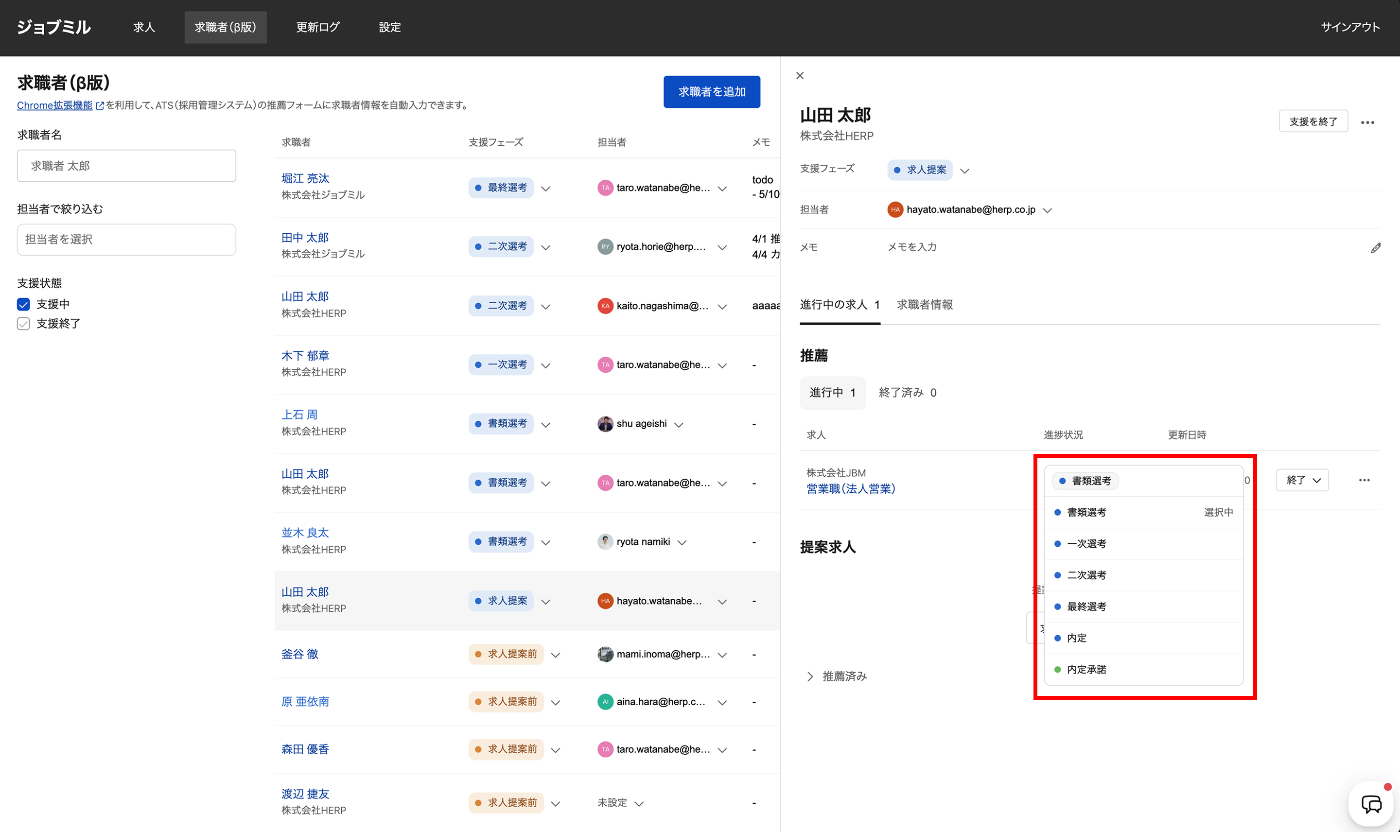2. 求職者詳細画面で、「推薦」の「進捗状況」のドロップダウン([書類選考]~[内定承諾])を開き、最新のフェーズを選択します。