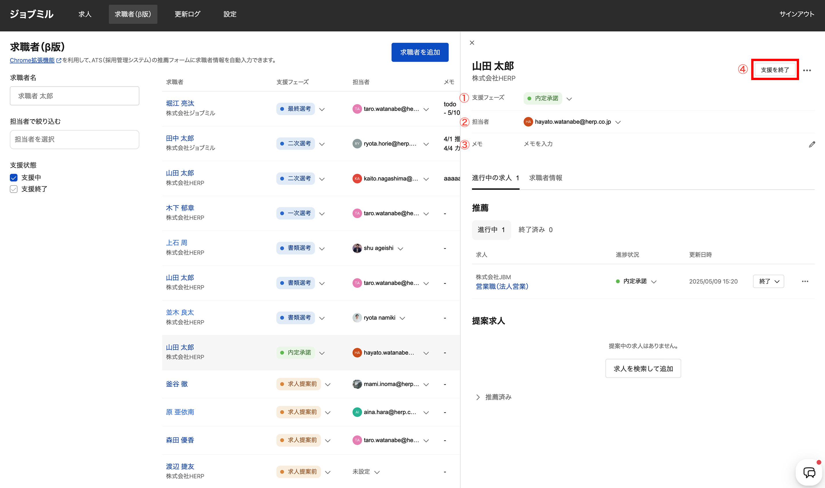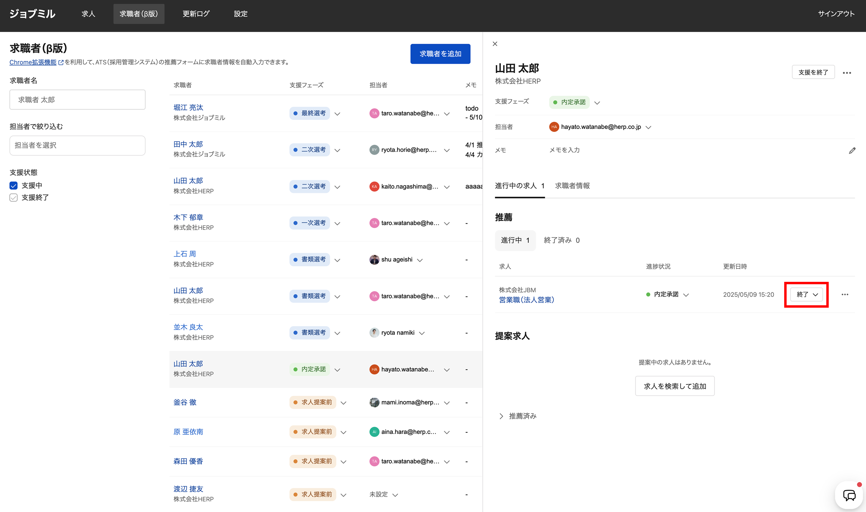 求職者詳細右上の [支援を終了] をクリックすると支援状態が「支援終了」に振り分けられます。