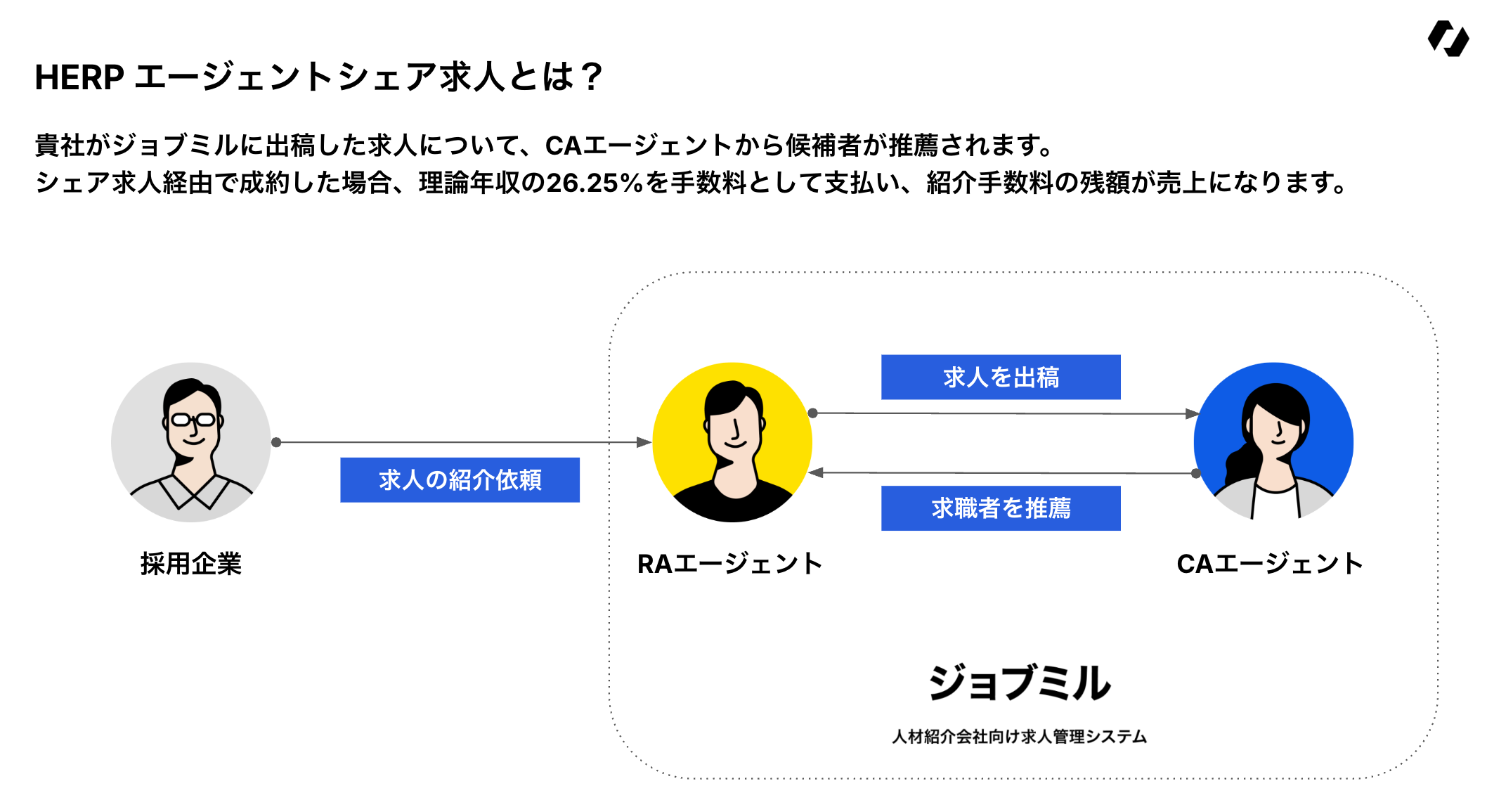 RA企業(求人企業紹介エージェント)側は、CA企業(求職者紹介エージェント)側から求職者を推薦され、当該求職者が入社した際に情報提供料をCA企業、成約手数料をHERPに支払います。