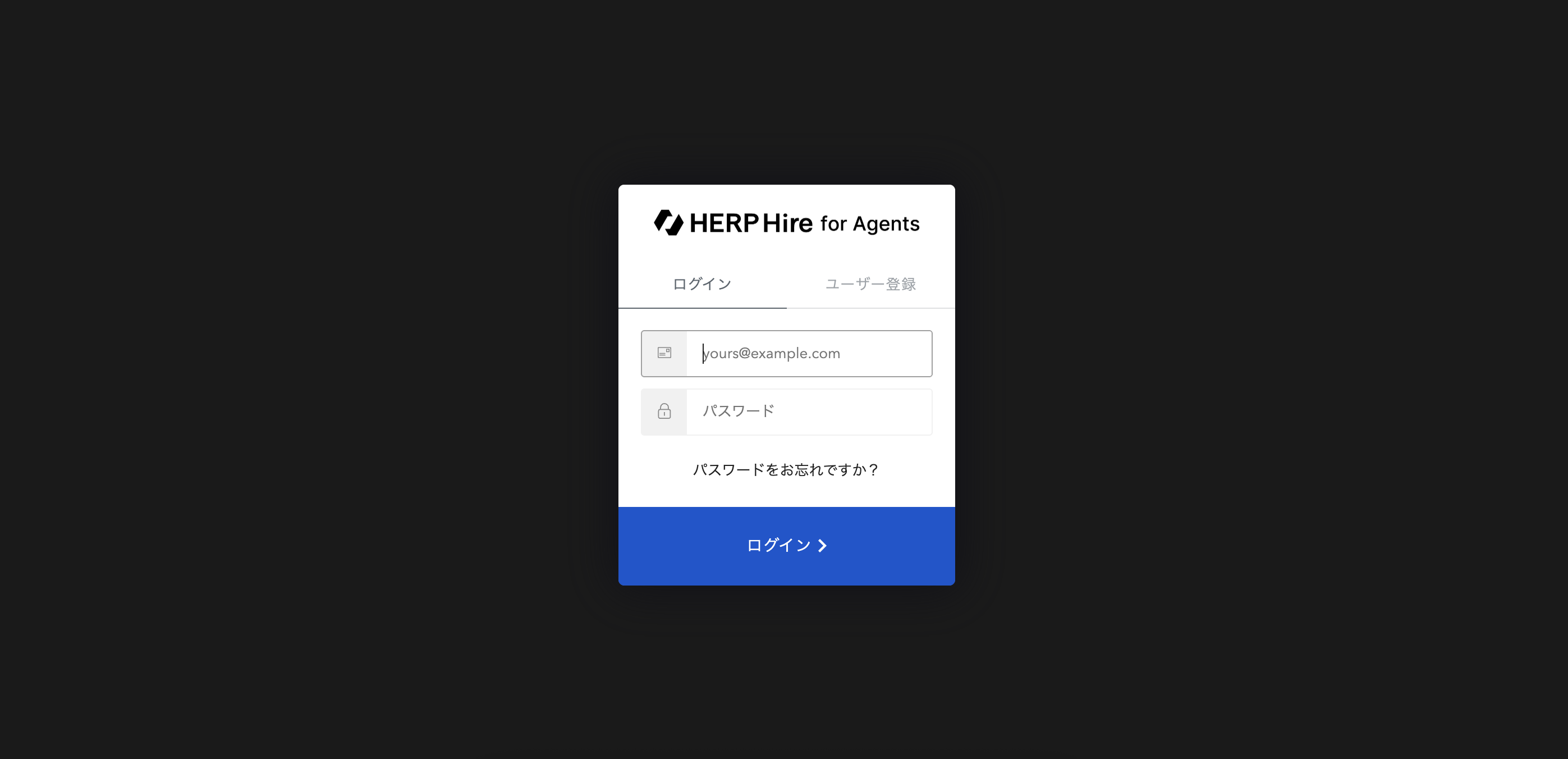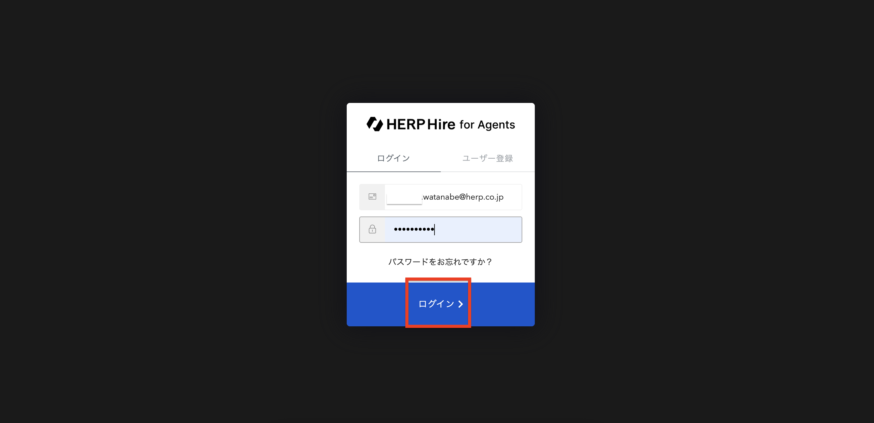 HERP Hire for Agentsユーザー登録時に設定したメールアドレス・パスワードを入力し、 [ログイン] をクリックします。