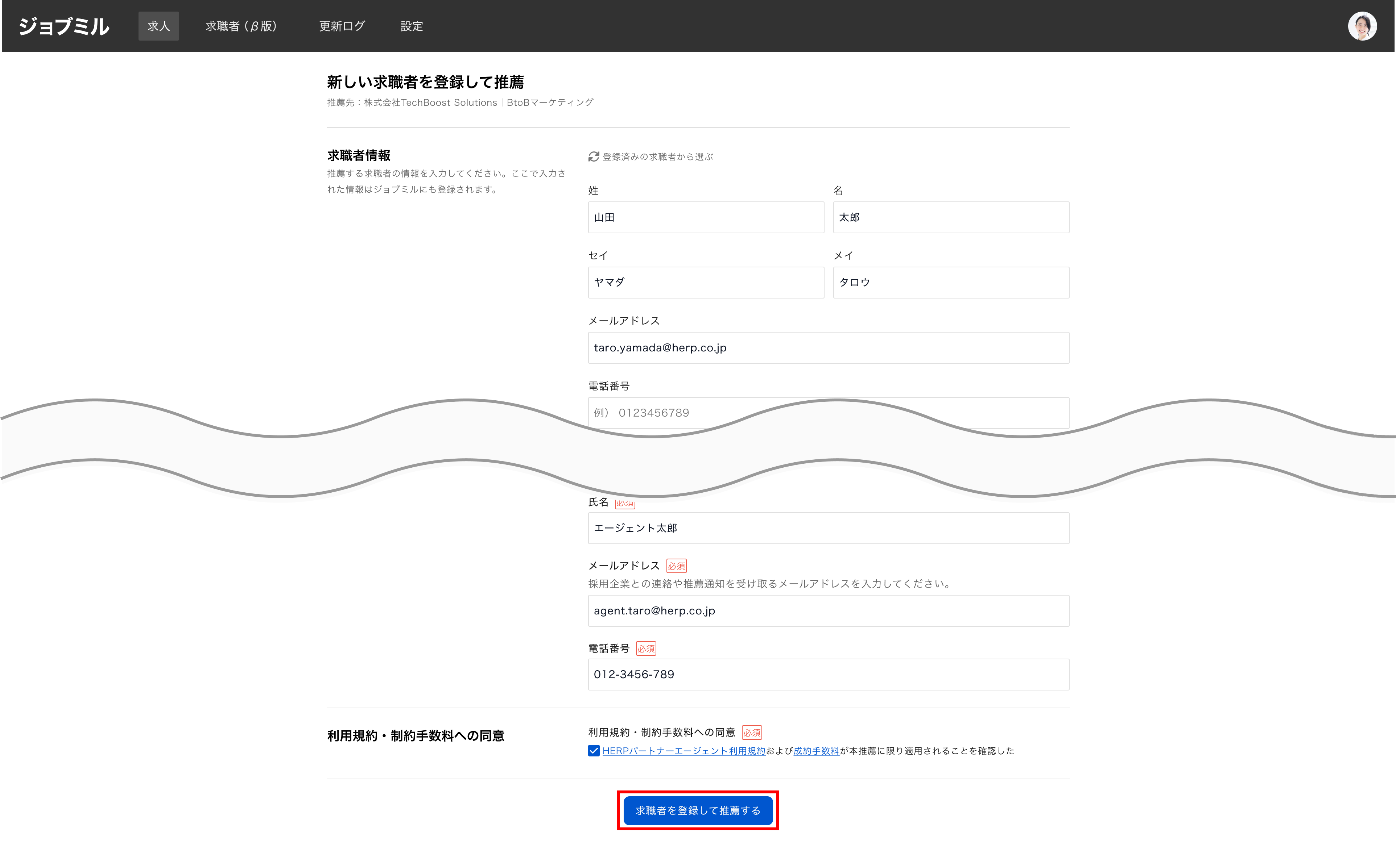 2. フォームに求職者情報とエージェント連絡先情報を入力し、[求職者を登録して推薦する] ボタンをクリック